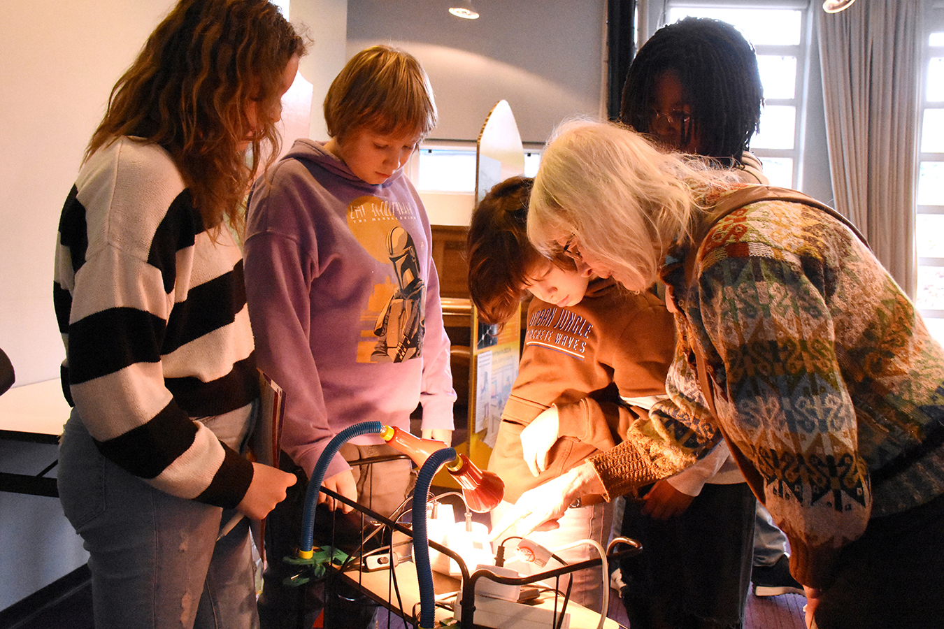 Kompas op Groen is er gekomen op initiatief van de energiecoöperaties in Gooi en Vechtstreek, waaronder HilverZon, legt Maya Heinsbroek van Omgevingseducatie uit. “Wij hebben het educatieve programma eromheen georganiseerd en de scholen benaderd om mee te doen.  Het idee is dat de leerlingen door zelf bezig te zijn, beseffen dat energiebronnen in de tijd veranderen, maar ook dat het belangrijk is om energie te besparen. Dat lukt met deze tentoonstelling heel goed.”